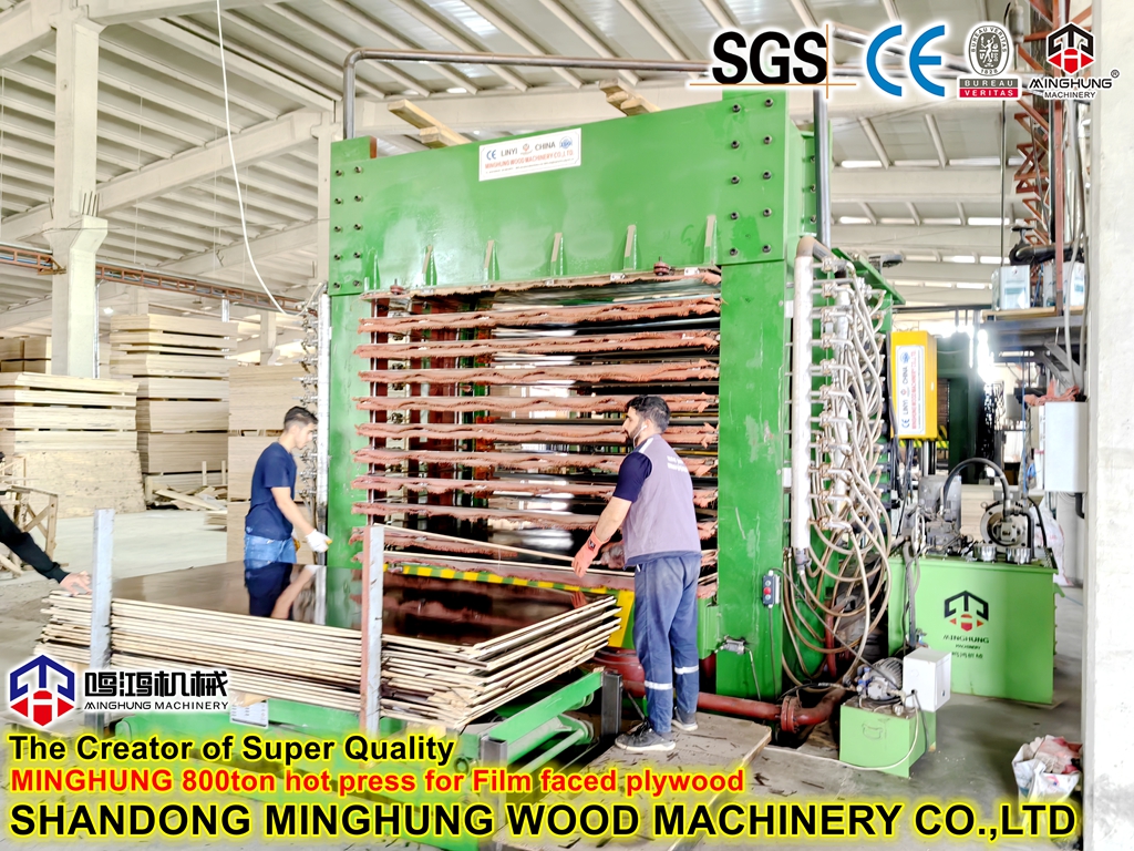Para fazer compensado revestido com filme, exceto a etapa de produção igual à produção de compensado bruto, como a máquina de fabricação de folheado, etapa de secagem de folheado, etapa de disposição, etapa de revestimento com cola, etapa de prensagem a frio, etapa de prensagem a quente, etapa de corte de compensado e etapa de lixamento, é preciso mais uma etapa -Máquina de prensagem a quente para laminação de filme.