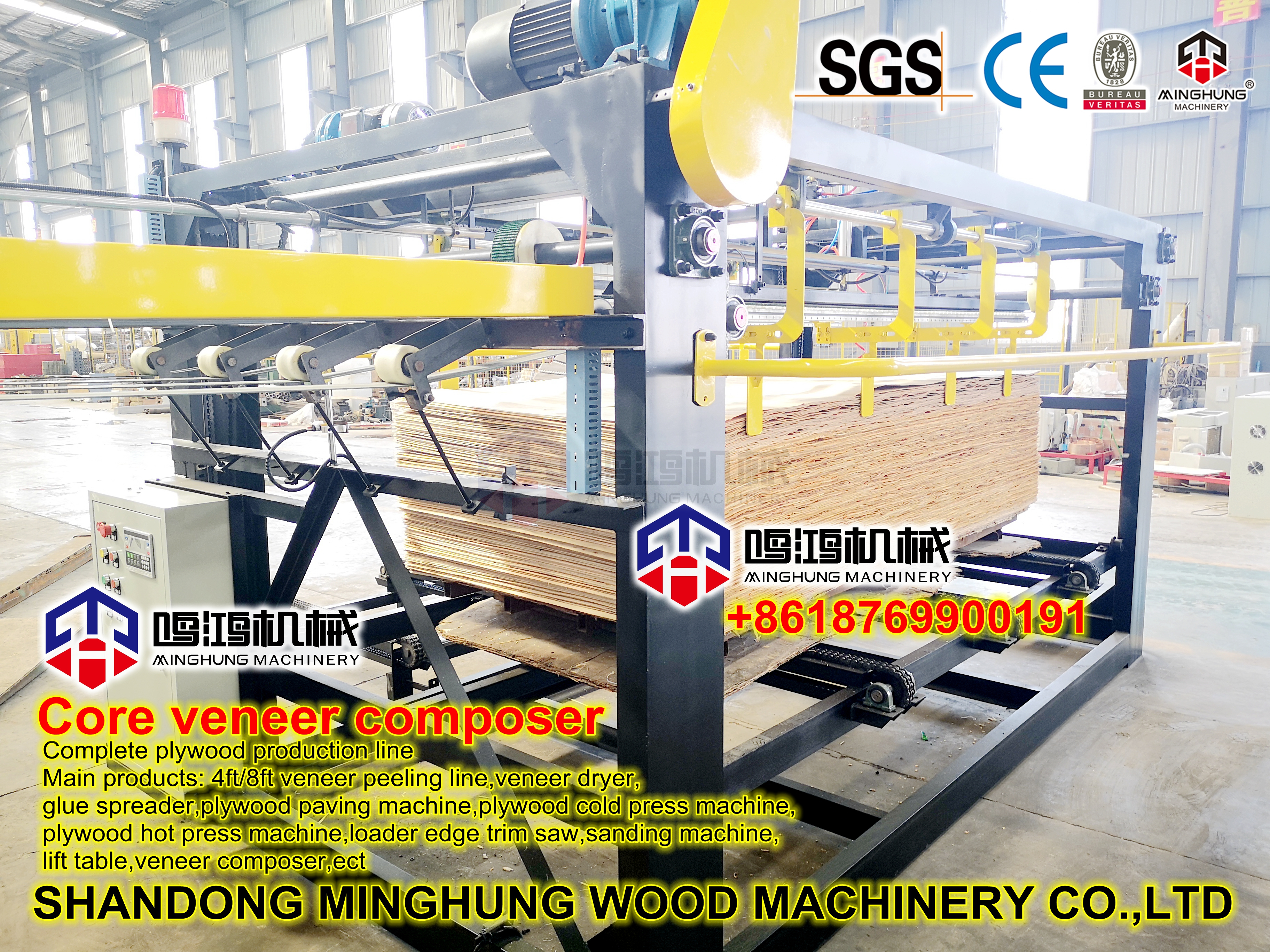 A função da máquina automática de composição de núcleo é unir folha de madeira de tamanho diferente em tamanho de madeira compensada, através de rosca de alta resistência e adesivo de fusão a quente.