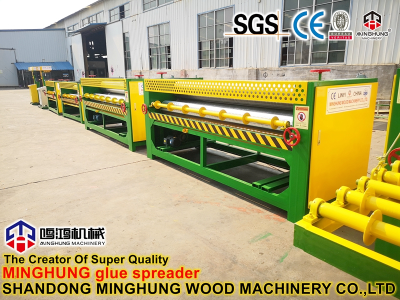 A função do espalhador de cola é cobrir principalmente a cola em ambos os lados do folheado de madeira compensada e, em seguida, os trabalhadores os pavimentam no tamanho da madeira compensada.