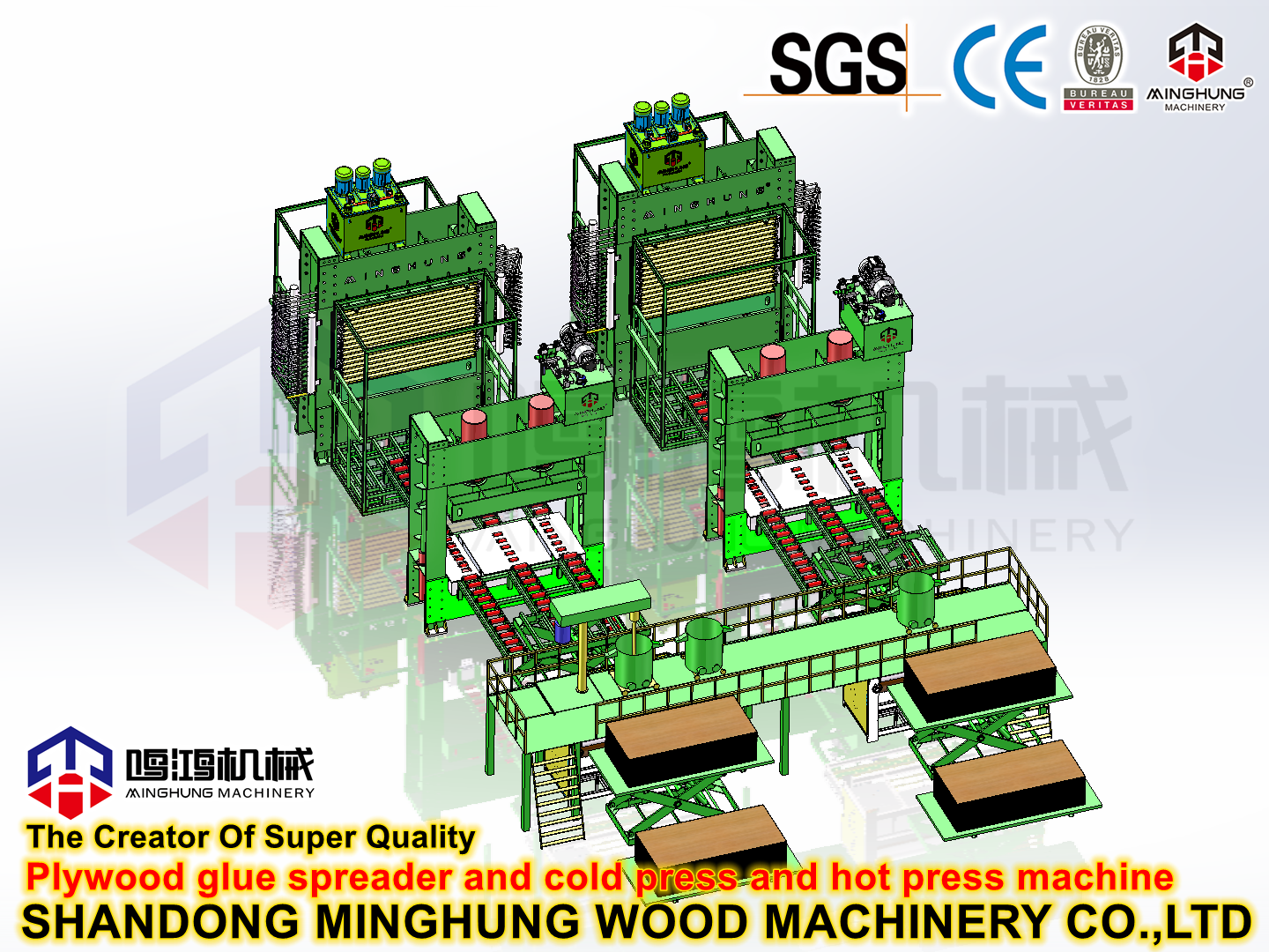 Máquina de prensagem a frio: É para compensado folheado colado pré-impresso por alta pressão, depois de pressionar um pouco, a cola interna derreterá e cada peça será moldada e transportará esse compensado para a máquina de prensagem a quente, será mais fácil e irá tornar a máquina de prensagem a quente mais rápida e eficiente.