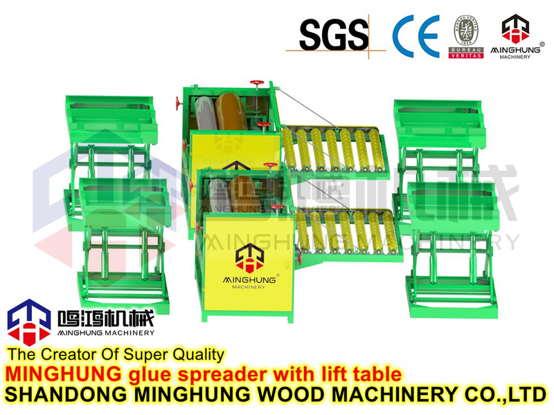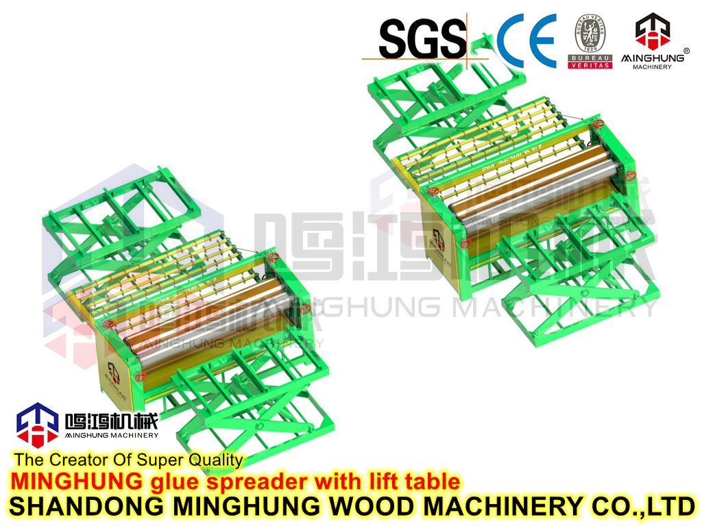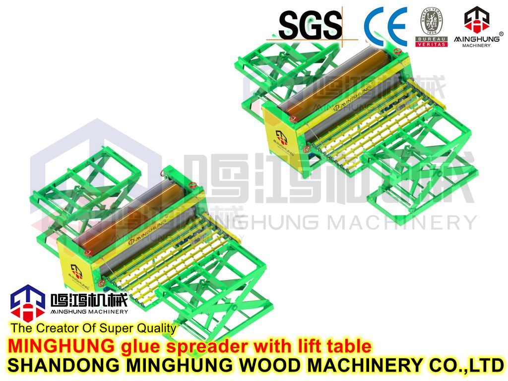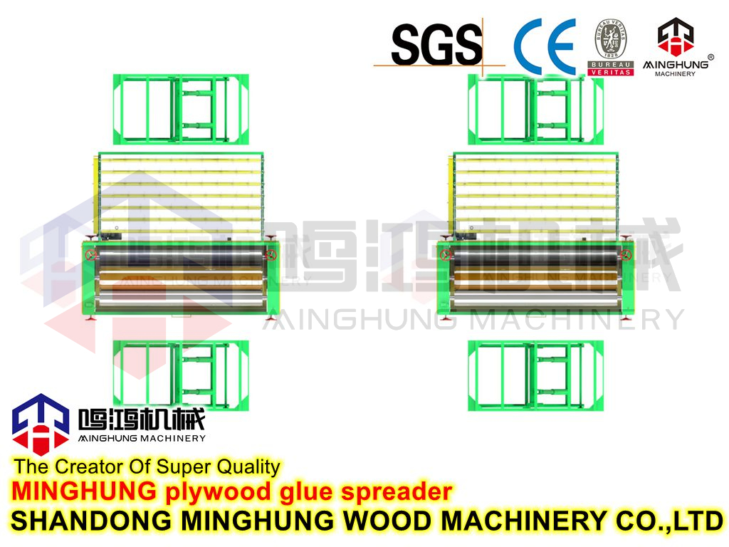 A função do espalhador de cola é cobrir principalmente a cola em ambos os lados do folheado de madeira compensada e, em seguida, os trabalhadores os pavimentam no tamanho da madeira compensada.