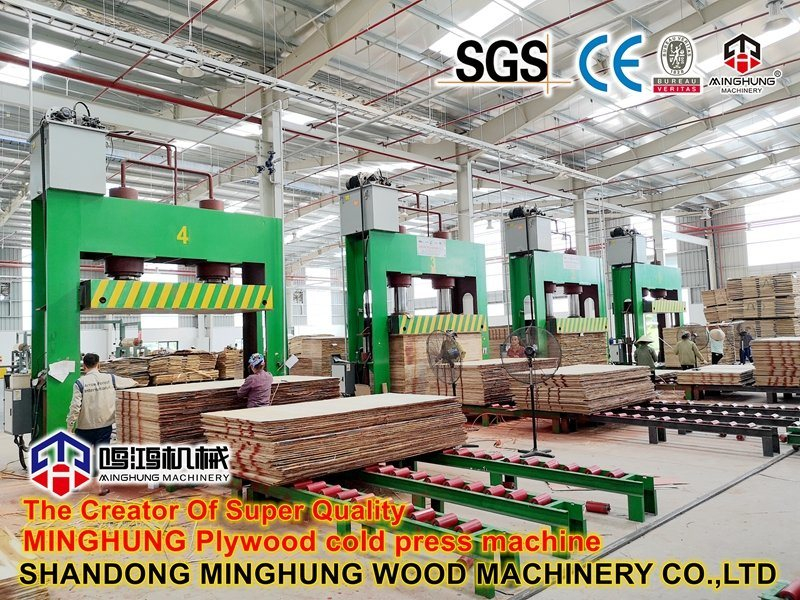Normalmente, a pressão da máquina de prensagem a frio pode ser de 400 toneladas, 500 toneladas e 600 toneladas, para tamanho padrão de compensado de 4 x 8 pés, prensas a frio de 500 toneladas são boas e suficientes.