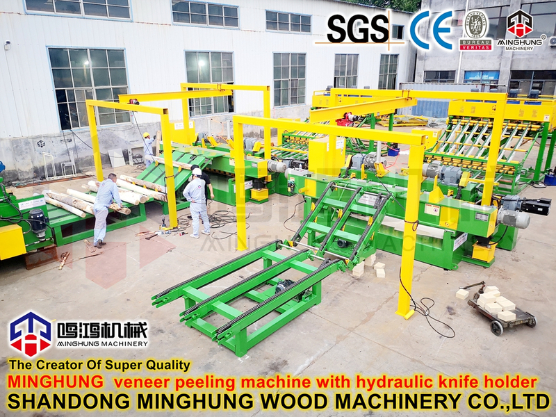 Torno de corte rotativo de folheado MINGHUNG adota o método de faca de pressão hidráulica, o que torna mais conveniente substituir a faca após o corte rotativo de folheado.
